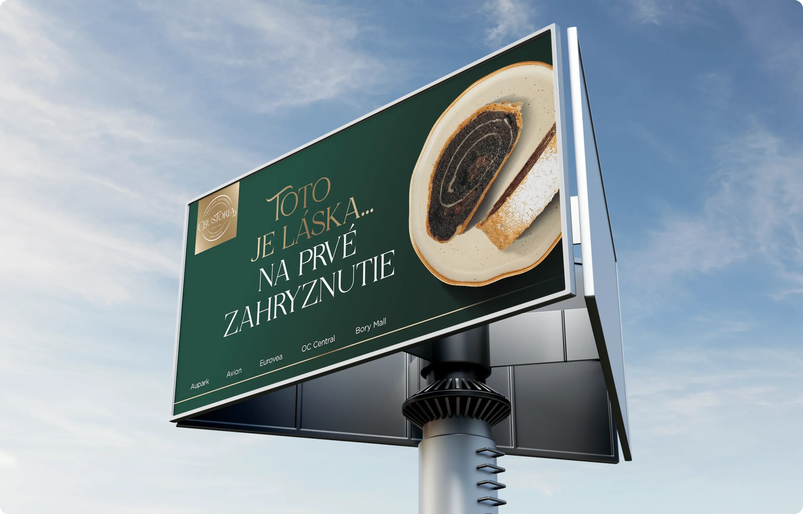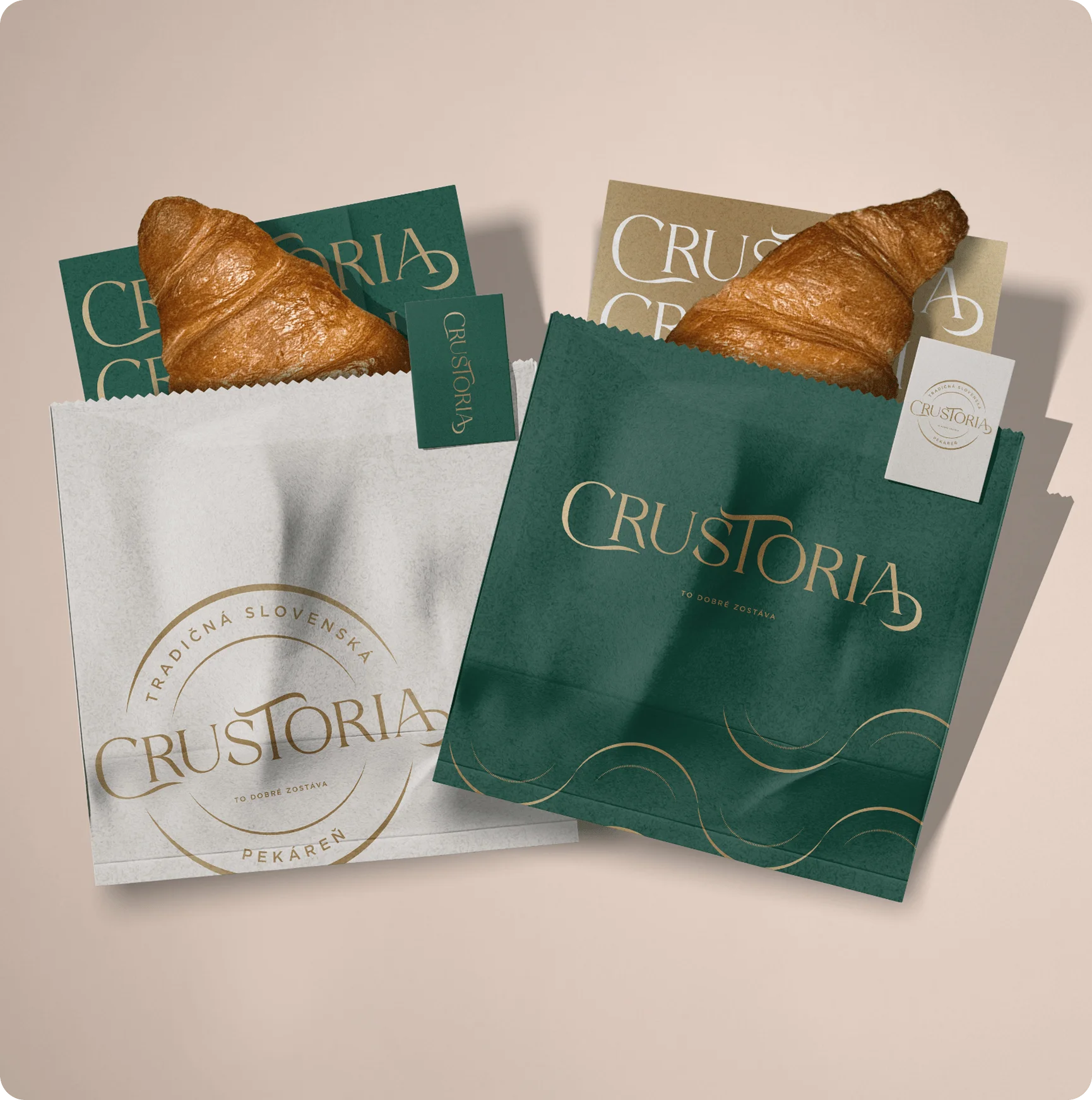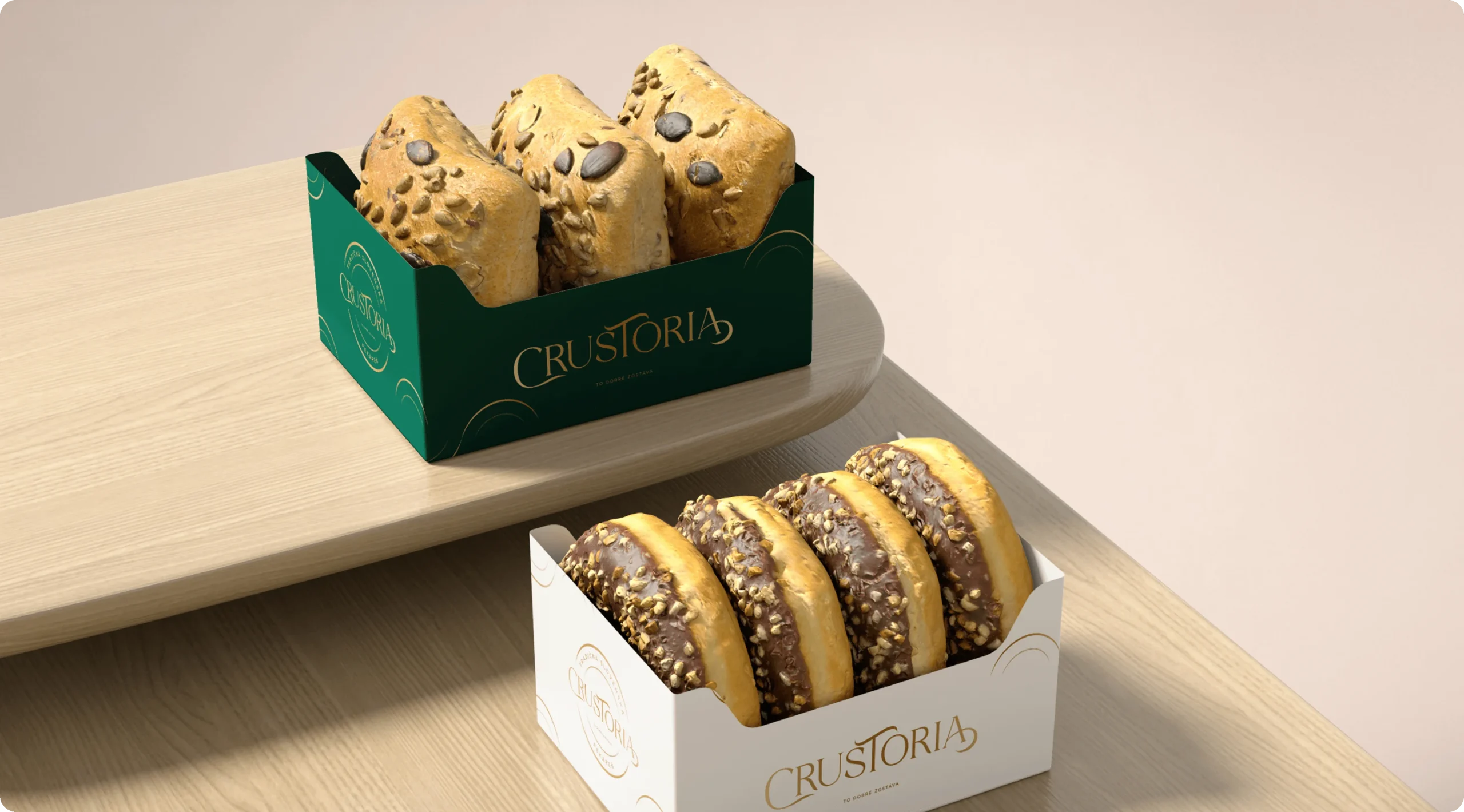 Crustoria je značka, ktorá spája poctivé remeslo a chuť tradície s moderným vizuálnym štýlom. Vytvorili sme pre ňu kompletnú identitu od loga až po priestorové riešenia predajní.